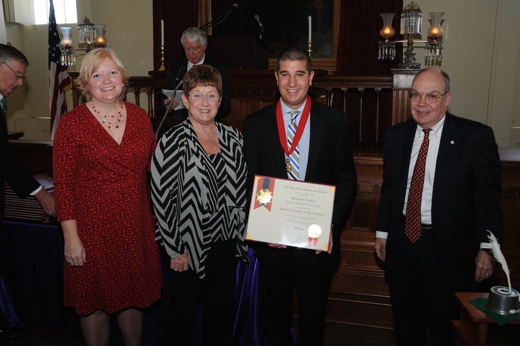 Mitchell Gurick of Darien, second from right, a student at Eastern Illinois University, was recognized as a Student Laureate by the Lincoln Academy of Illinois during a special ceremony November 1 at the Old State Capitol in Springfield. Standing with Gurick are, from left, Dr. Julie Chadd, Ethel Holladay and Lincoln Academy Vice Chancellor William Bennett, far right.