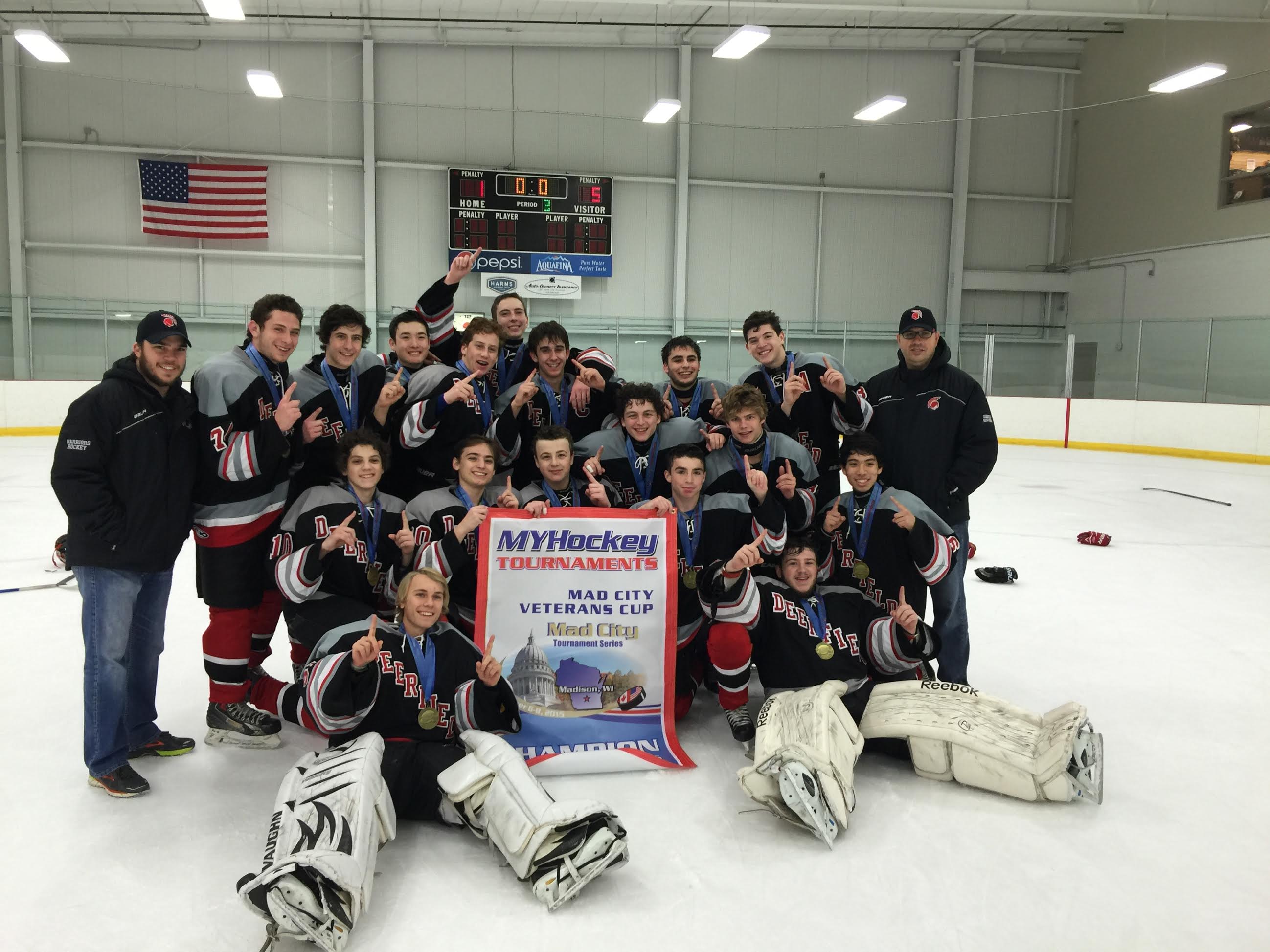The Deerfield High School Hockey Club, consisting of varsity and junior varsity teams, competed in the Mad City Veteran’s Cup in Madison Wisconsin last weekend. This year the divisions had top teams from Canada, Minnesota and Wisconsin. The varsity team took home the championship after reeling off four consecutive wins.