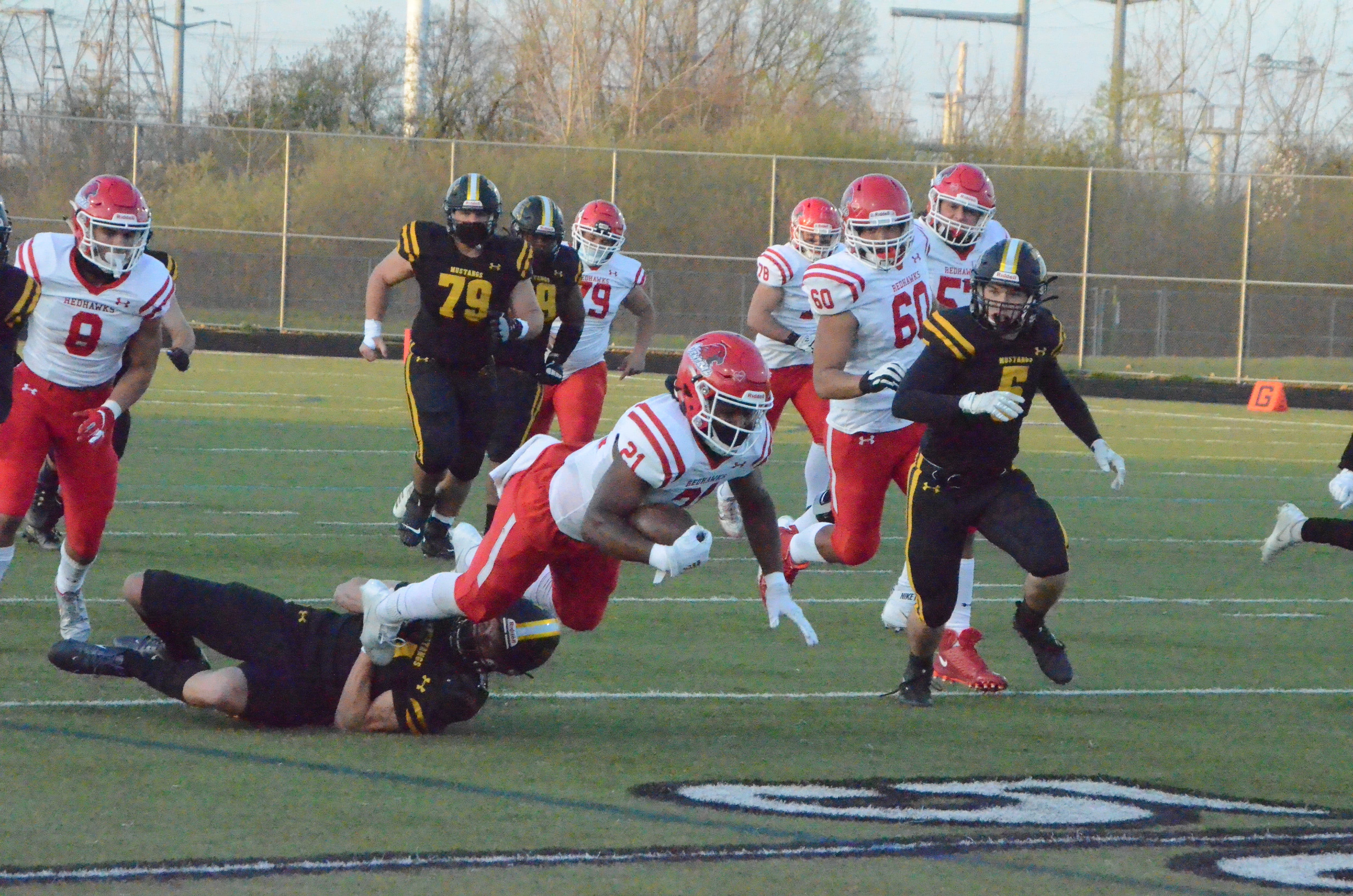 Al Benson sent in this photo of Naperville Central senior running back Jaden McGill (21) being tripped by Metea Valley's Ryan Danko in the Redhawks' 42-7 win at Metea Valley. McGill ran for 133 yards and scored three touchdowns.