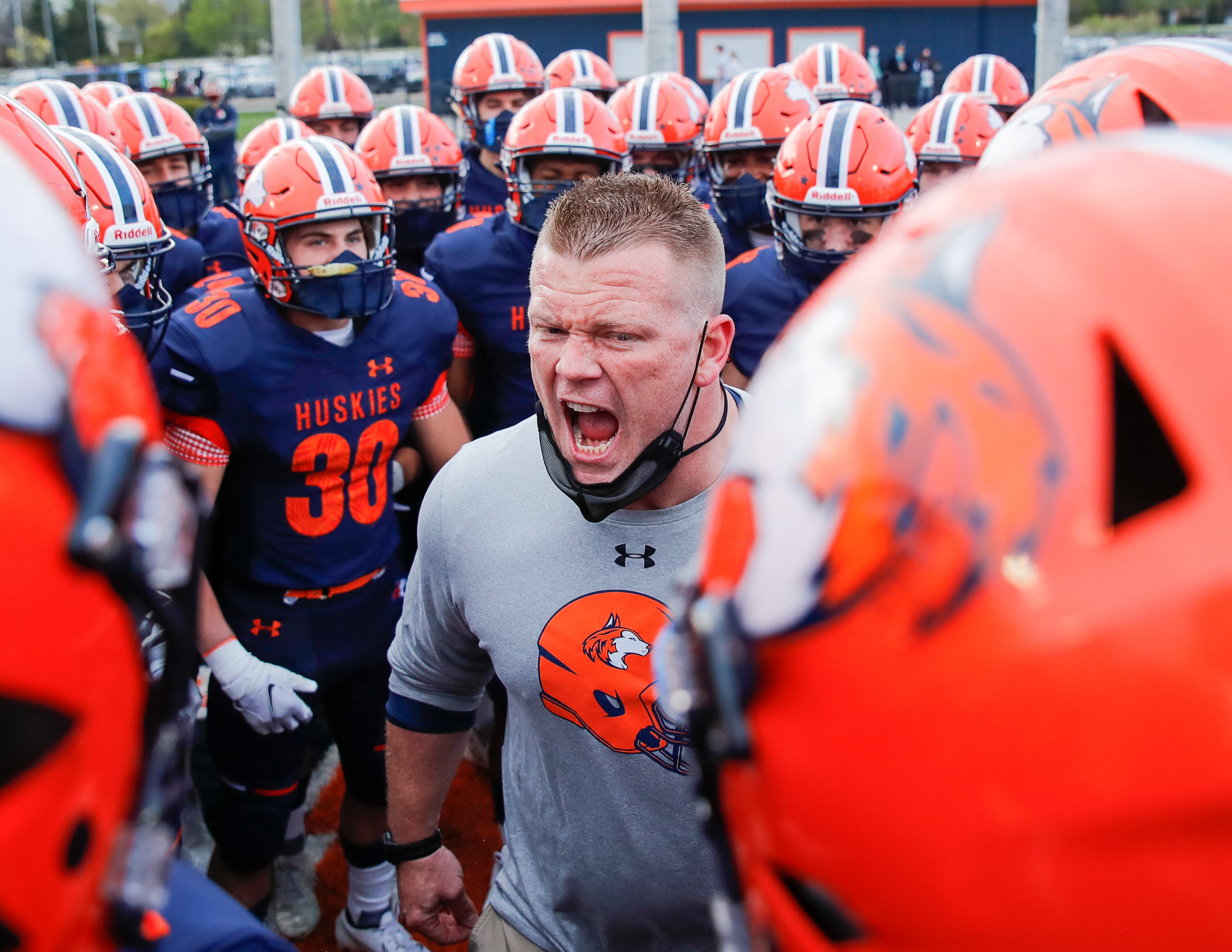 Chip DeLorenzo captured this photo of Chris Arthurs, Naperville North High School defensive coordinator, firing up the troops before a senior night game against DeKalb.