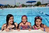 Caption: Sophia(13), Helena(10), and Mina(8) Katsikaris pose for a photo on opening day of Chippewa Pool.