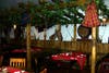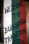The welcoming outdoor courtyard has eight large tables with umbrellas and a wall cheerfully painted "Welcome to Bulgarian Tradition." Inside, the outdoor European taverna theme continues with ivy strewn trestles, creating a canopy over the tables, hanging lanterns and decorative wine casks. Even the bathrooms are artfully painted.