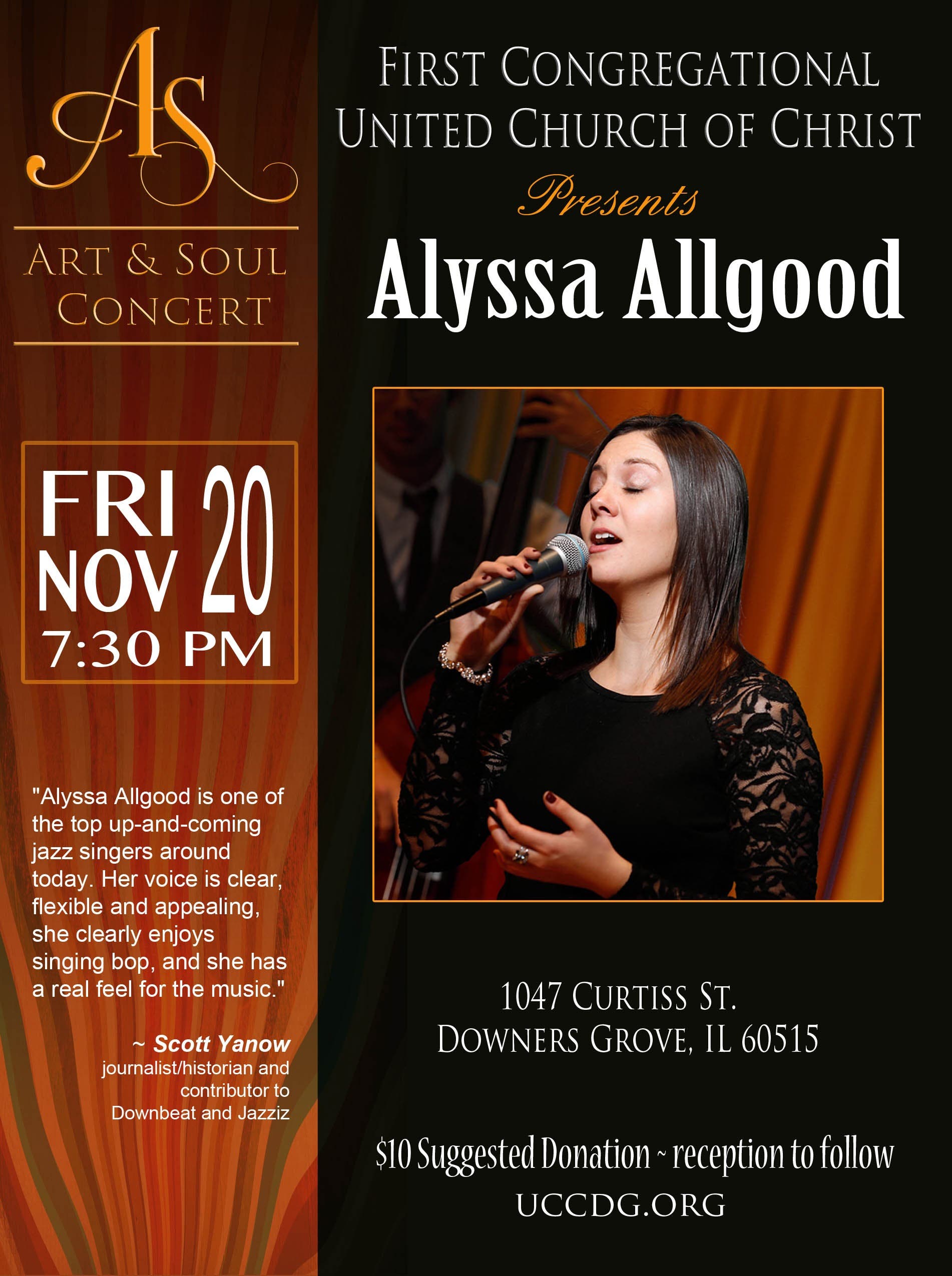 On Friday, November 20th at 7;30 pm, Alyssa Allgood will be performing at First Congregational United Church of Christ in Downers Grove .