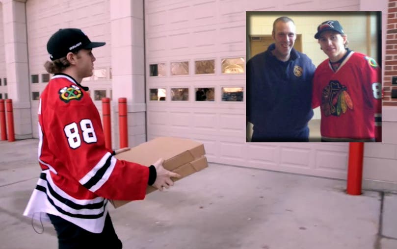 Downers Grove firefighter Kevin O’Leary was treated to a special delivery, with a piping hot pizza delivered by Chicago Blackhawks right wing Patrick Kane.