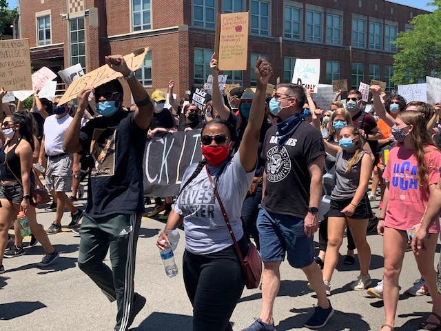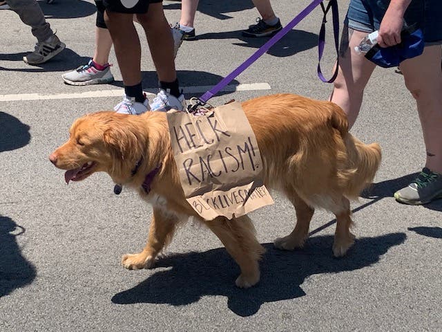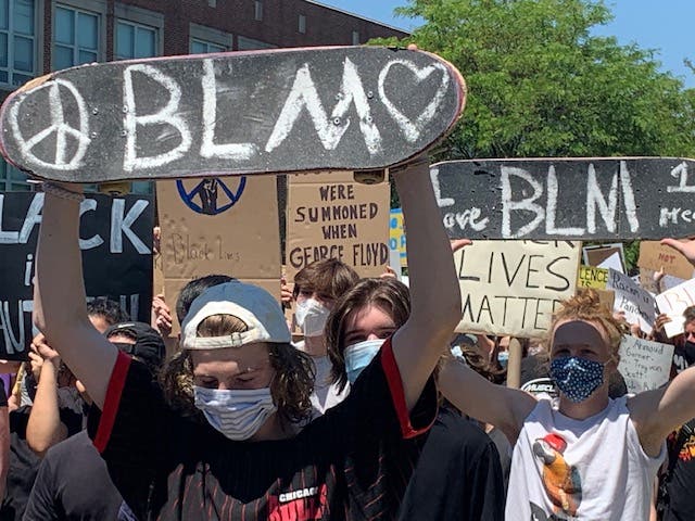 DOWNERS GROVE, IL — The street outside of Downers Grove North High School was quiet as hundreds of people took a knee and held five minutes of silence before a protest and march for racial justice and equality. From small children holding signs that read "Black Lives Matter," to young adults holding skateboards emblazoned with the letters "BLM," to dogs wearing signs that said "Heck Racism," the crowd was filled with residents and people from surrounding towns who came out to protest in the wake of George Floyd's death.