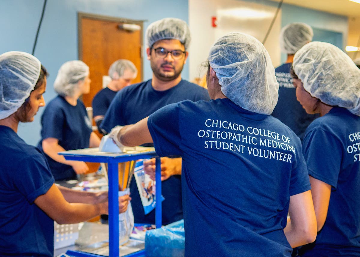 Before beginning their rigorous course of study, first-year medical students at Midwestern University participate in an annual day of service. This year, 204 new students at the University’s Chicago College of Osteopathic Medicine (CCOM) packed food, sorted donations, cleared brush, and more as part of their orientation program. The following are just some of the projects completed by the students: