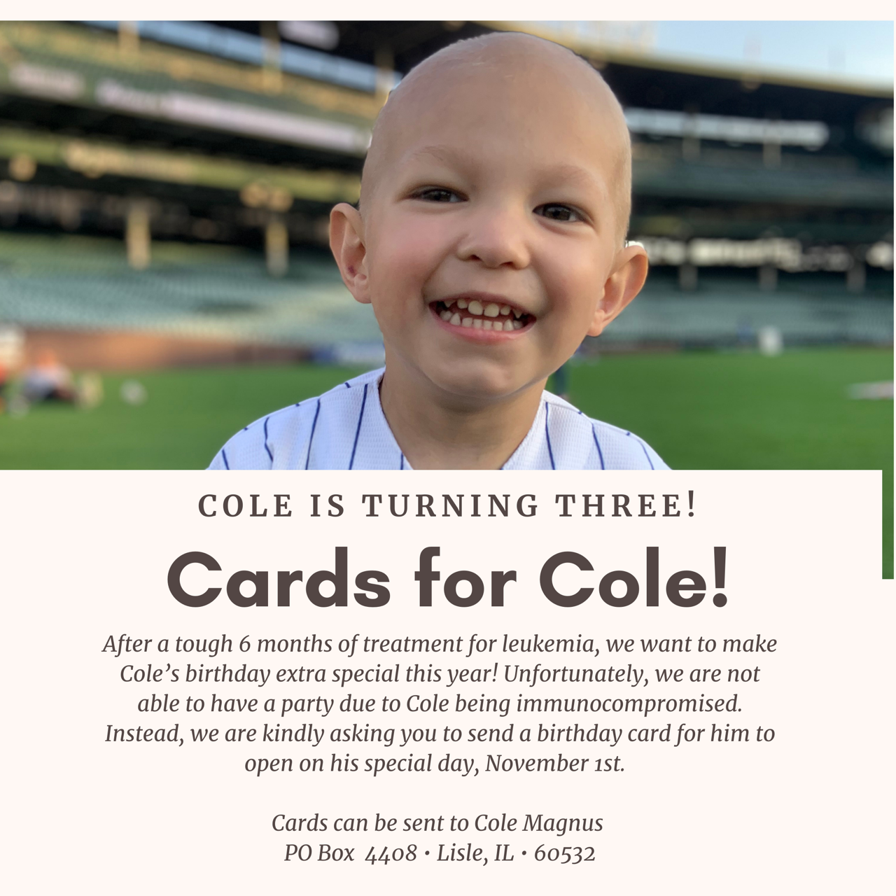 DOWNERS GROVE, IL —Cole Magnus is battling leukemia. For his third birthday, his parents are hoping for plenty of cards to help make his day special.