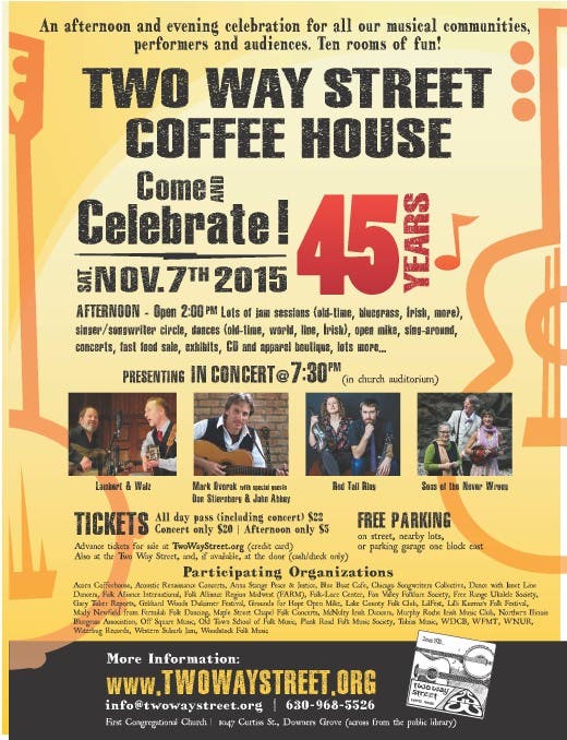 In 1984, the Village of Downers Grove asked the Two Way Street to create a Folk Music Festival for the Downers Grove Heritage Festival. It grew from the original three hours on Saturday to include a concert on Friday night followed by several hours of folk music on Saturday, and ran for 26 years. Currently, the coffee house presents a day of music in Fishel Park as part of the Downer Grove Rotary Grove Fest.