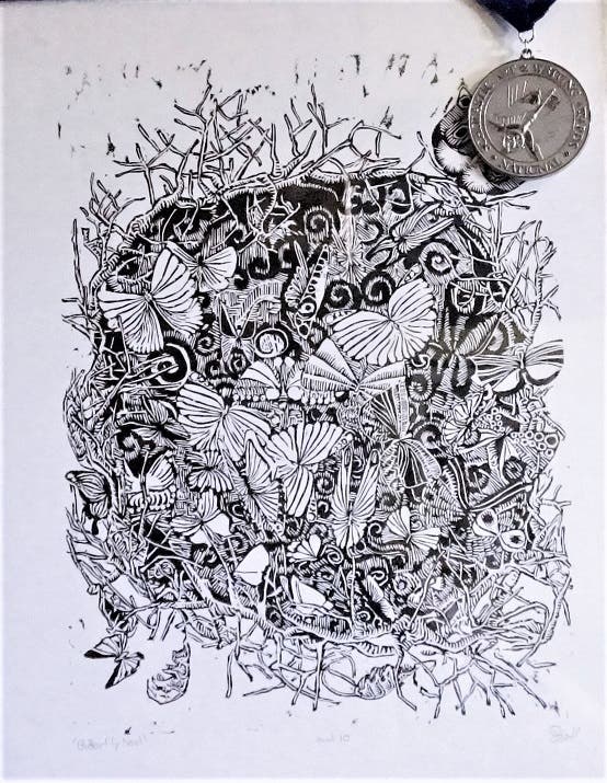 Rebecca’s work was first judged at the regional contest back in January at Downers Grove North High School where four of her works won awards including one Best in Show. At Carnegie Hall, she received a Gold Award for her massive 50” X 27” print entitled “Fish Tank” and a Silver Award for her “Butterflies” print.