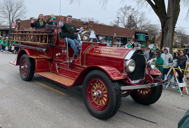 A decades-old Elmhurst fire truck makes its way through the St. Patrick's Day Parade. (David Giuliani/Patch)