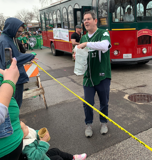 A man distributes goodies along the parade route. (David Giuliani/Patch)