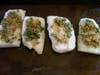 On a chopping board or counter, pour a mound of breadcrumbs. Add finely minced garlic, a handful of your favorite fresh herbs, salt, pepper, lemon juice and a few generous glugs of olive oil (about 3-4 T). With a large knife, chop all ingredients together and give a little mash to create a palette of paste for your fish. Pile a couple of spoonfuls onto each fillet, bake on a baking sheet for 20 minutes or so until flesh is opaque and cooked all the way through.