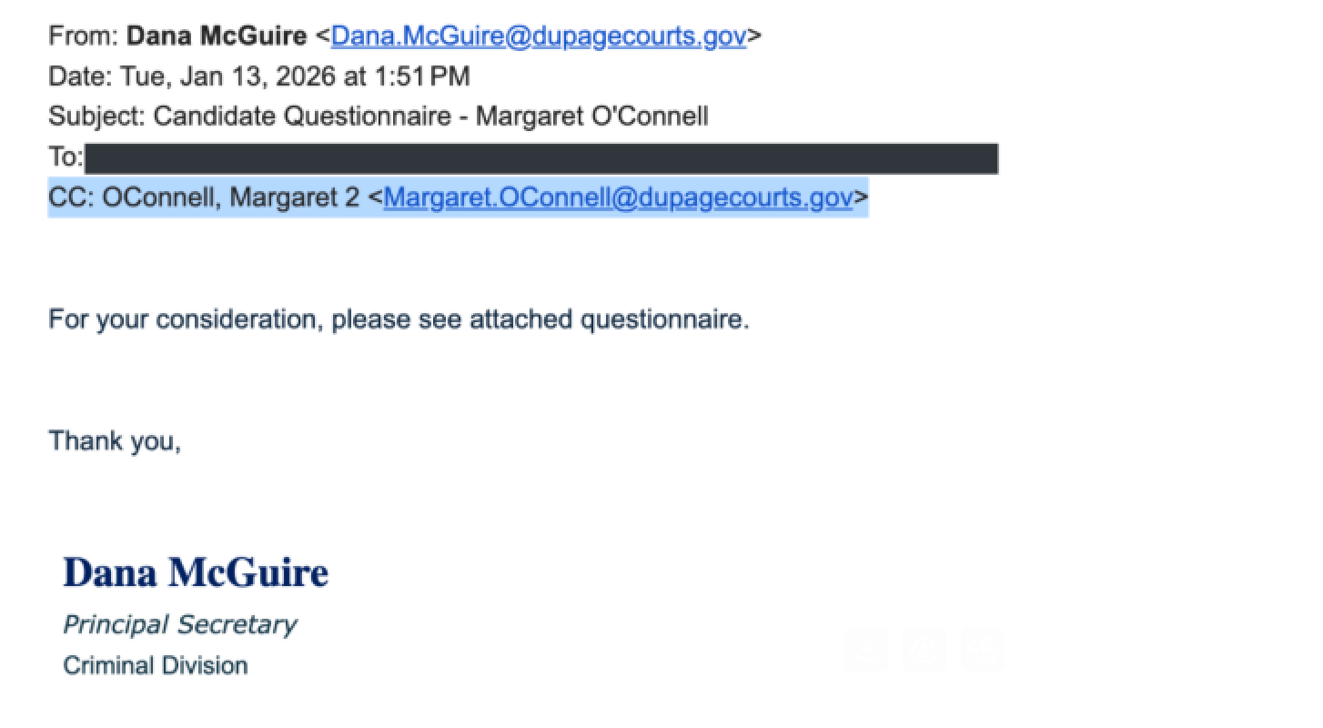 Shortly before 2 p.m. Tuesday, Jan. 13, McGuire appears to have sent an email titled, "Candidate Questionnaire – Margaret O'Connell." The email's recipient is redacted.