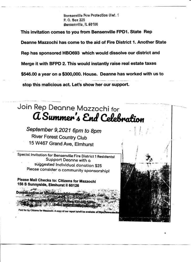 The flyer in question contended Mazzochi was working with the district to fight legislation that would dissolve the entity and put the area under the jurisdiction of Bensenville Fire District No. 2. It is one of the two agencies that gets Fire District No. 1's yearly checks.