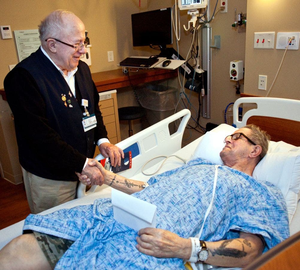 Guilio Camerini, hospital volunteer and military veteran, meets U.S. Marine Corps and Korean War veteran Homer Hill, 76, of Downers Grove.