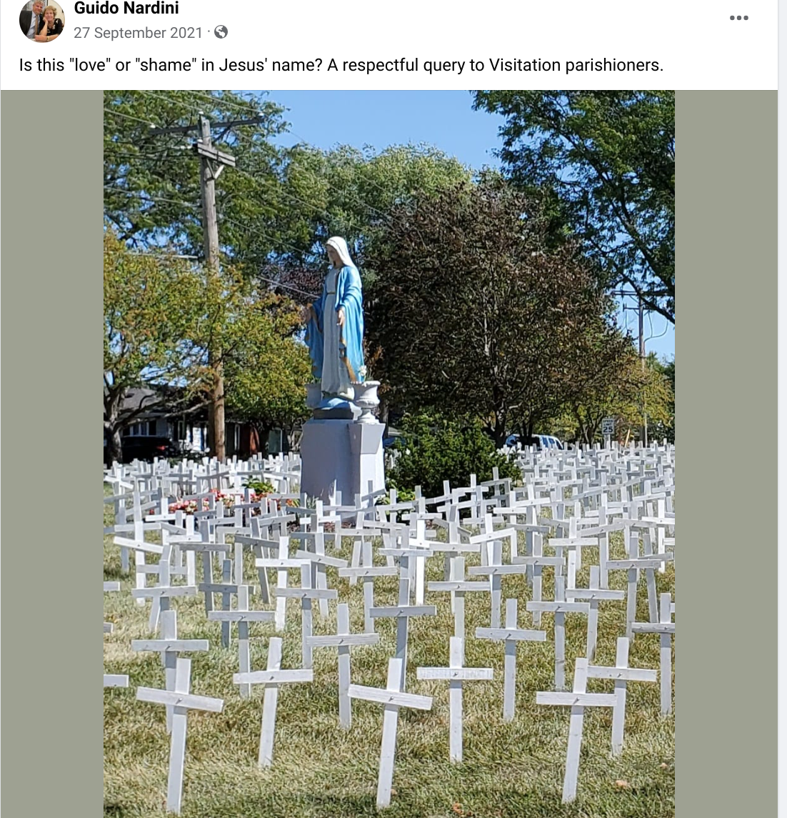 In September 2021, he wrote about the crosses, "Is this 'love' or 'shame' in Jesus' name? A respectful query to Visitation parishioners."