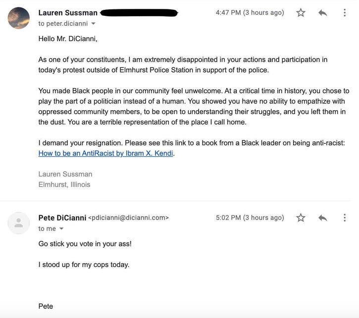 Later that afternoon, Elmhurst resident Lauren Sussman sent a message to DiCianni's county email account to say she was "extremely disappointed" in his actions and participation in the demonstration earlier that day. Addressing the county board member, "Mr. DiCianni," she demanded his resignation and suggested he read "How to be an Antiracist" by Ibram X. Kendi.