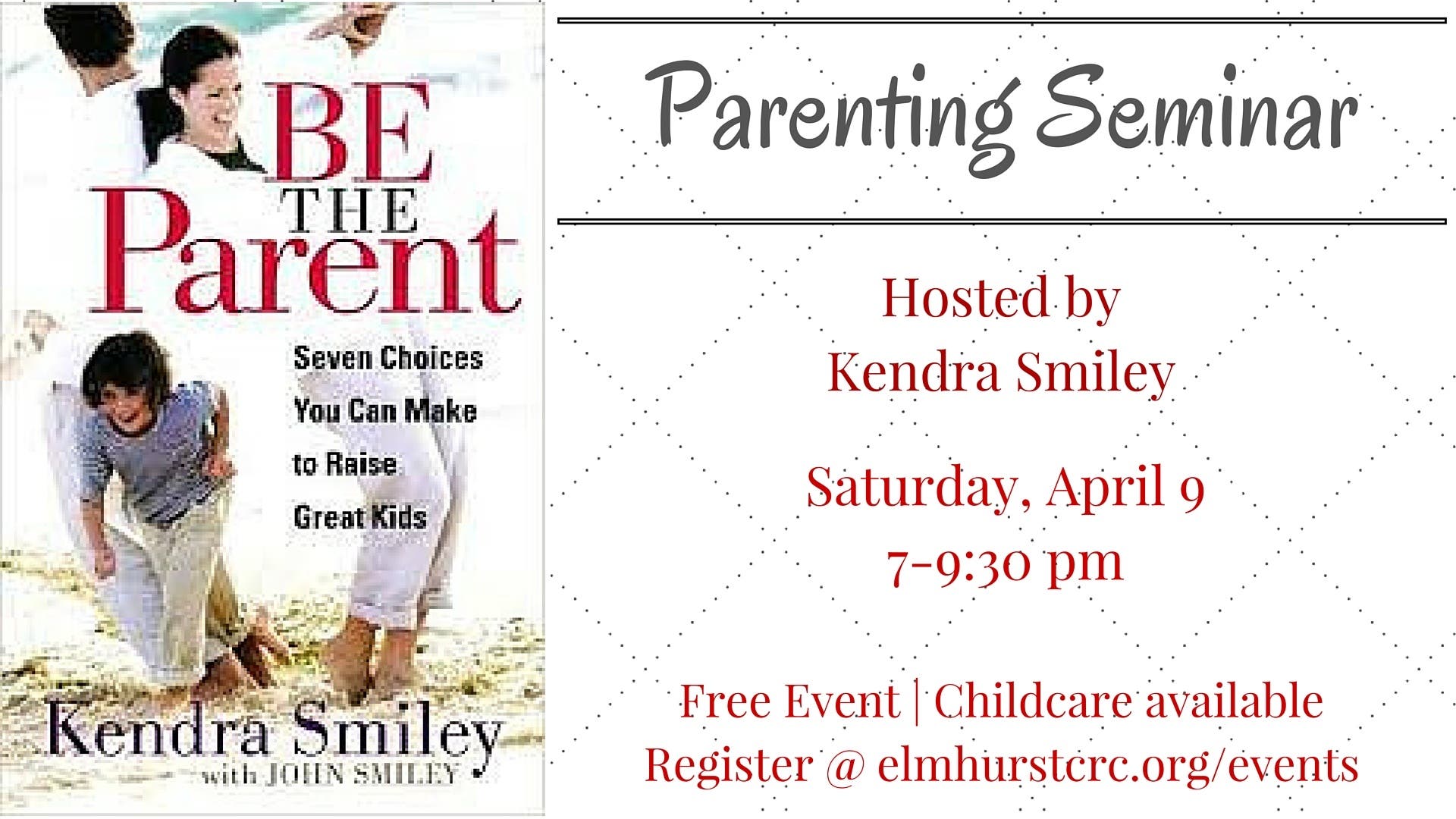 Join us for a free Seminar: BE THE PARENT: Seven Choices You Can Make to Raise Great Kids with author Kendra Smiley, Sat. April 9 7-9:30 pm.