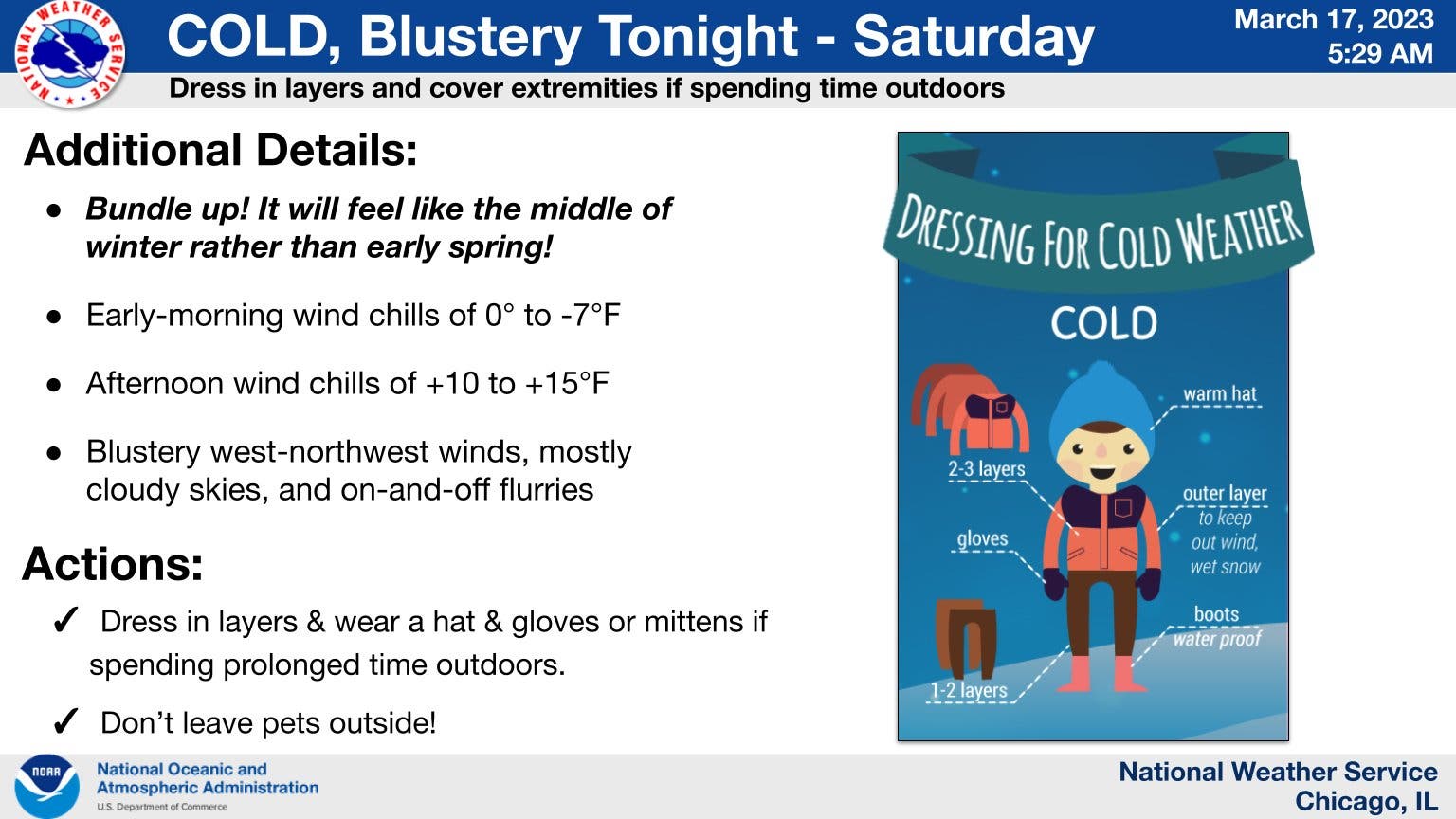 Early morning wind chills on Saturday could reach 7 below zero, the weather service said. Saturday will also be blustery, with gusts up to 30 mph.