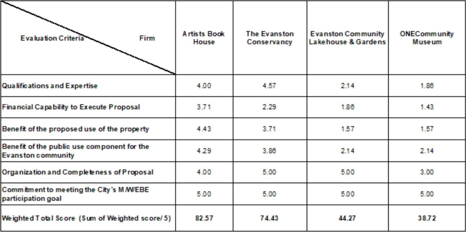 City staff scored the proposals on six criteria. (See full scores below.) Three quarters of the score was devoted to the benefit of the site's proposed use, the financial capability of the proposal and the qualifications of each team. The other quarter of the score was made up of the community benefit, the completeness of the proposals and their commitment to meeting the city's goal of participation by businesses owned by minorities, women or Evanstonians.