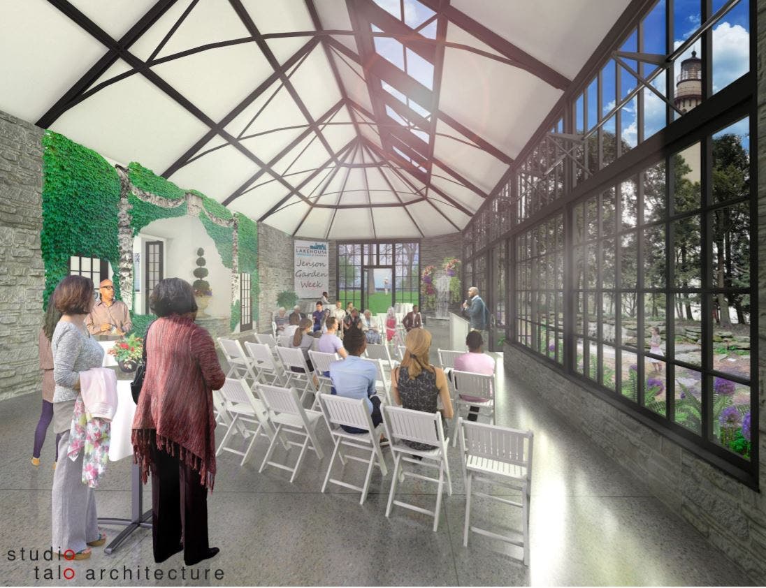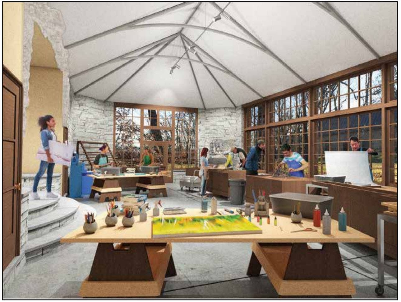The proposal calls for a gallery, event and exhibition space and preschool on the ground floor, a cafe and kitchen on the first floor and patio, a co-working office and conference space on the second floor and space for mindfulness and movement programming on the third floor. The lower level would include performance and maker spaces, while the greenhouse and conservatory would be used by a local farm and the coach house would be turned into a bike shop and cafe.