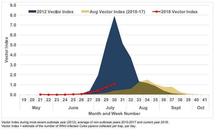 Last week, the district reported the the risk of human infection was high, with both the number of mosquitoes and number infected with West Nile virus was above average. There were 104 positive samples among the first 933 batches tested this year. In the last 229 through the end of last month there were 120.