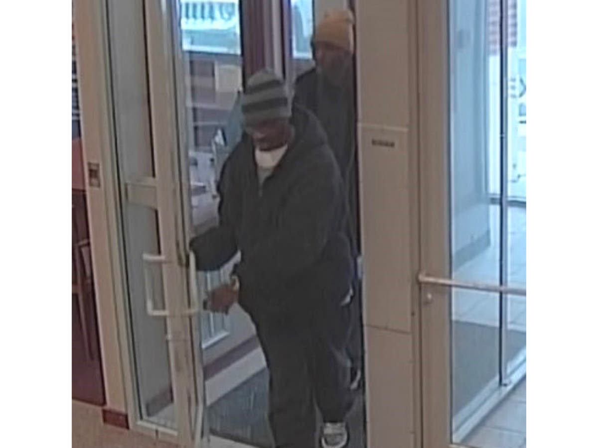 The other man was pictured standing with his hands in his pockets near the bank's entrance. He was described as about 6 feet tall and between 40 to 50 years old. He wore a tan knit hat, a black jacket and dark pants.