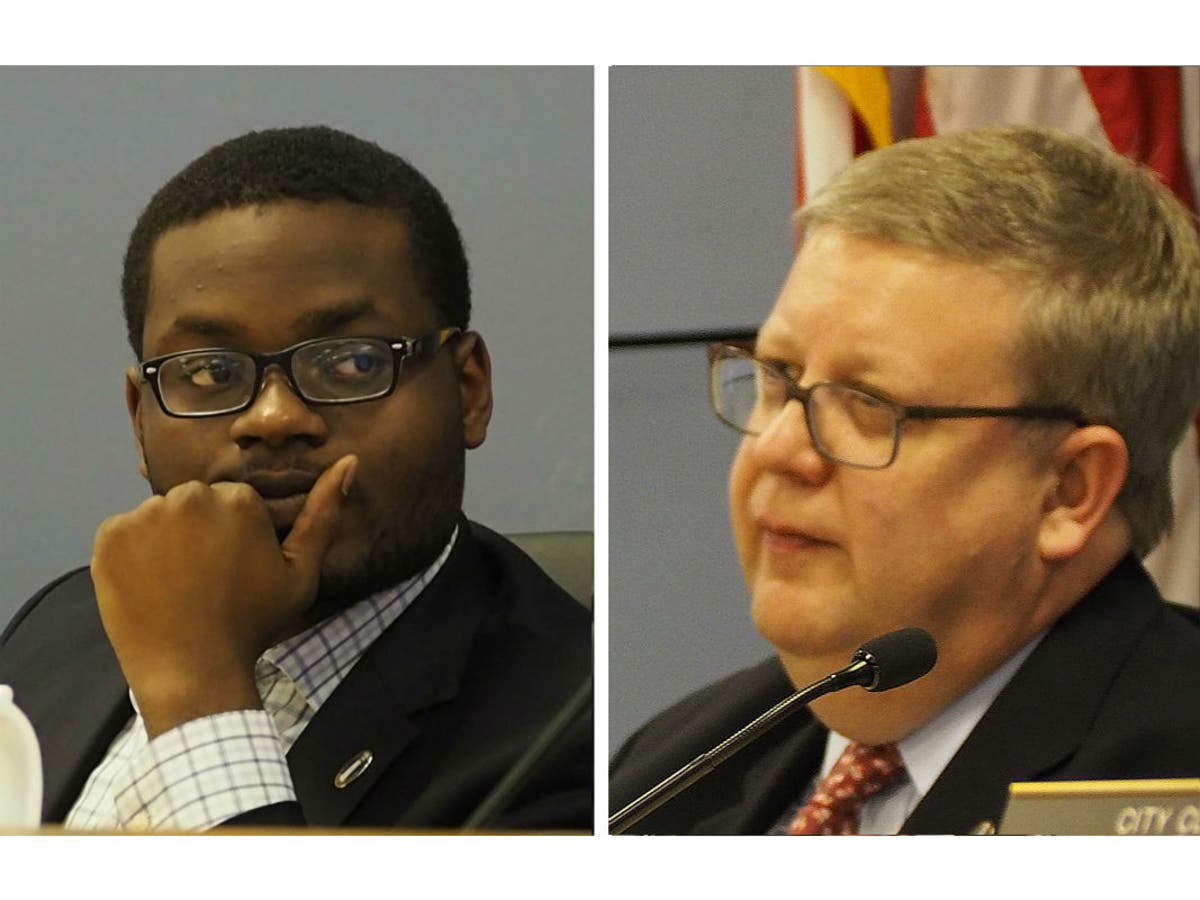 Top photo: Evanston City Clerk Devon Reid (left) has clashed with City Manager Wally Bobkiewicz (right) since taking office in May, 2017