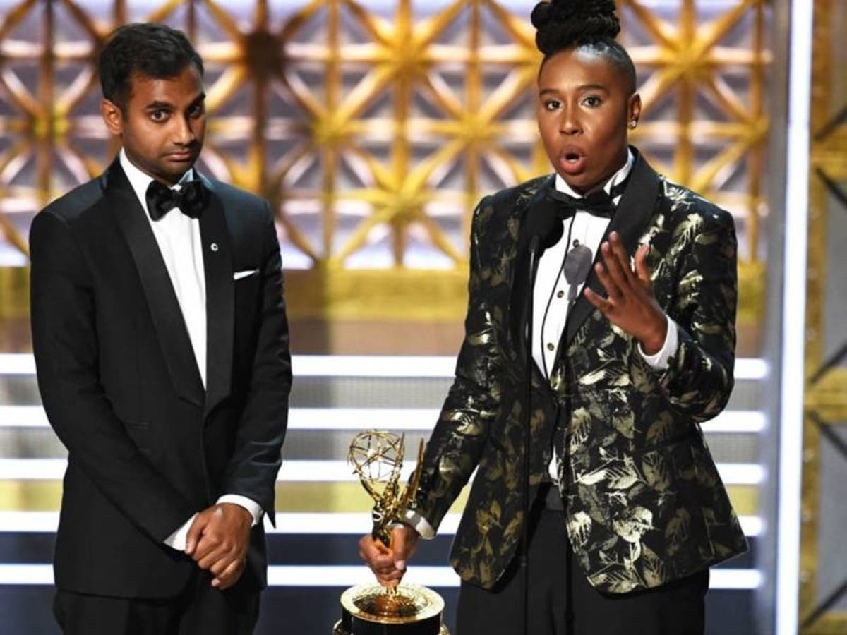 Lena Waithe (right) and Aziz Ansari accept the Emmy Award for writing in a comedy series during the ceremony Sunday, Sept. 17. (Photo by Kevin Winter | Getty Images Entertainment | Getty Images)