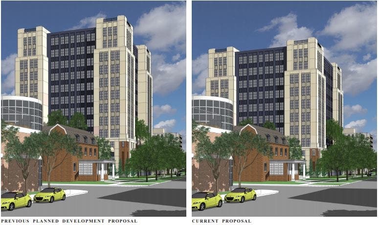 The proposed height of the tower has fluctuated. It started with 14 stories, was reduced to 11 for the RFP, grew again to 13 and was last month cut again to 11 stories.
