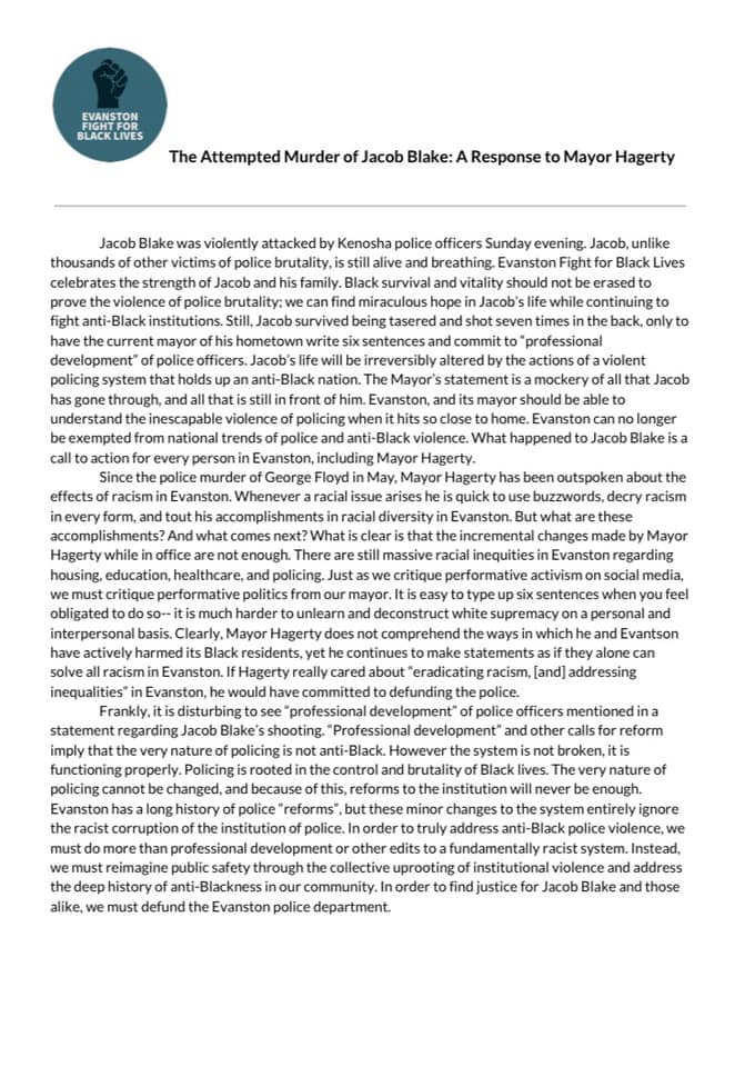 "I was devastated to learn of yet another police-involved shooting of a Black man in our country. Although this horrific incident occurred in Kenosha, Wisconsin, Jacob Blake has deep roots in Evanston, and his family has long worked to advance civil rights in our city and beyond," Hagerty said.