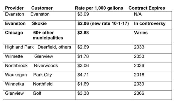Evanston's lawyers included the following table in their lawsuit, noting it was "incontrovertible" that the rate charged to Skokie is "in many cases" much less than what is paid by other water customers in "comparable communities."