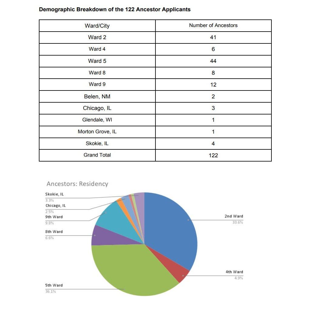 About 70 percent of the applicants in the ancestor program are residents of Evanston's 2nd and 5th Wards. Four are Skokie residents, three live in Chicago, two now live in New Mexico, one lives in Wisconsin, and another lives in Morton Grove, according to a staff memo.