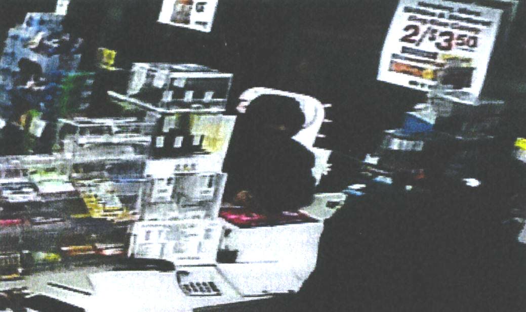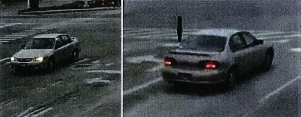 Video surveillance from the intersection and a business to the south of the Shell station showed a gold or light tan Chevrolet Malibu with a rear spoiler and sticker in the window driving around the station before the robbery and leaving the scene afterwards.