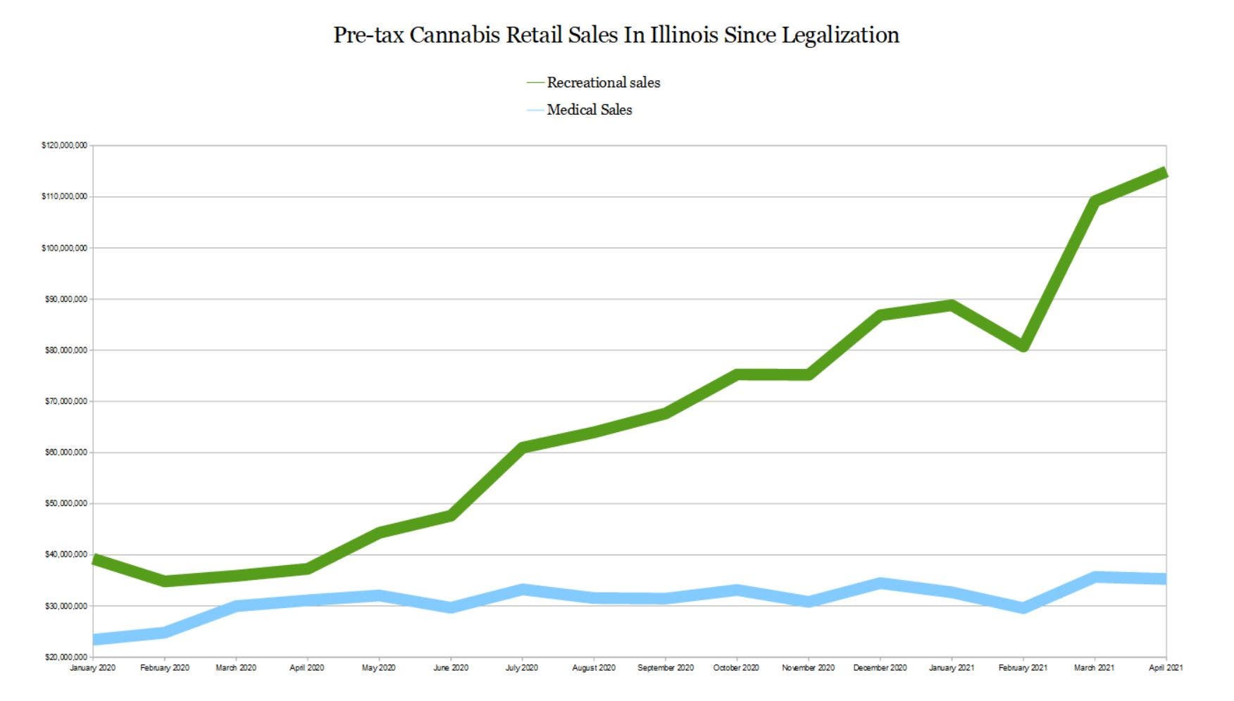 Sales data from state regulators shows Illinois residents spent about $80 million, before taxes, on recreational cannabis in April.