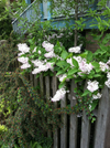 After the magnificent bloom of the Crabapple trees in Evanston it's Lilac Time, and we are even nearing the end of that season. Not well known is the lilac shrub grown on a standard to create a little tree. The top is a shrub, Syringa patula 'Miss Kim,' and the bottom is a lilac trunk. These last about 10-12 years (some apparently much longer) and then the tight branching right at the graft seems to get overcrowded and they can split or cause some branches to die. The fragrance is wonderful while they last The old Syringa vulgaris is still a favorite, here pictured nodding over a fence on Ashland. ('vulgaris' means common or ordinary in both Horticulture and Medicine.) Too soon the lilacs will be gone, but the roses will then be blooming.