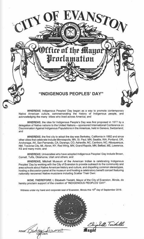 EVANSTON, IL - Evanston Mayor Elizabeth Tisdahl signed a proclamation earlier this year indicating her support for an Indigenous Peoples’ Day to be held in the city to honor all the contributions Indigenous people have made to society.