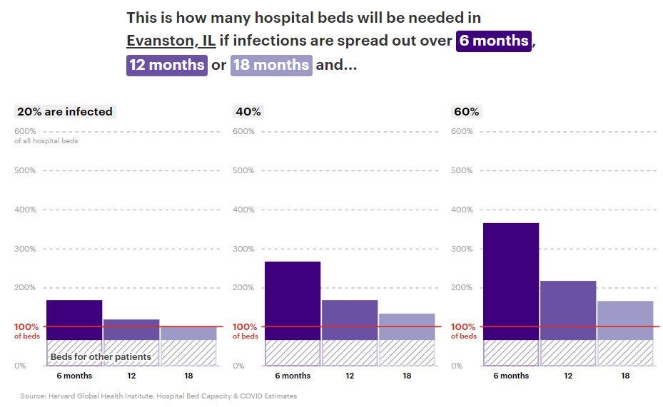 EVANSTON, IL — North Shore hospitals will need to expand their capacity to handle the influx of patients projected by even the most optimistic models of the spread of the new coronavirus, according to data from the Harvard Global Health Institute cited Tuesday in a ProPublica report.