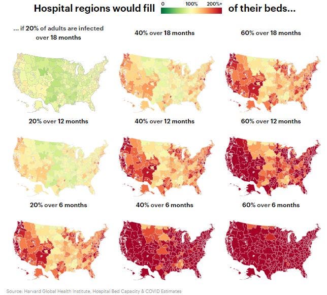 To examine where the need for additional hospital beds would be most acute, researchers considered nine scenarios for how the COVID-19 pandemic might proceed across the United States. They modeled what would happen if 20 percent, 40 percent or 60 percent of adults contracted the novel coronavirus, and whether they caught it over the next six months, 12 months or 18 months.