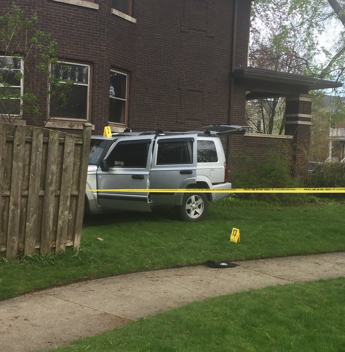 Police said a silver Jeep crashed into the fence of a house at the corner of Sherman Avenue and Lincoln Street after fleeing a canine officer who had tried to pull it over after just hearing gunfire in the 2100 block of Darrow Avenue at 3:22 p.m. The officer had briefly pursued the SUV before the chase was called off, according to Cmdr. Ryan Glew.
