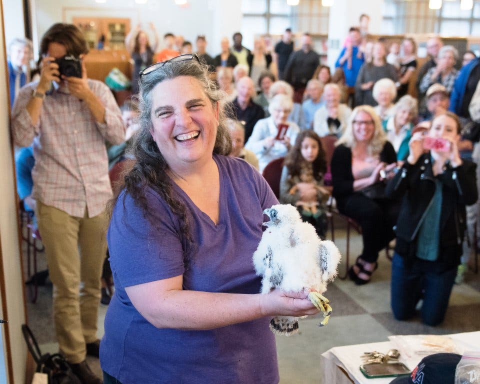 This spring marks the 15th consecutive year that falcons have made a home atop the library. Every year that fledglings depart their fourth-floor nest, the library hosts a ceremony to name the new falcons as scientists from the Chicago Peregrine Program at the Field Museum.