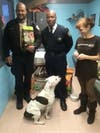Evanston Animal Warden David Rose, Police Commander James Pickett and Evanston Animal Shelter volunteer Alisa Kaplan were present for the adoptable dog, Donna, to enjoy her first taste of Merrick food.