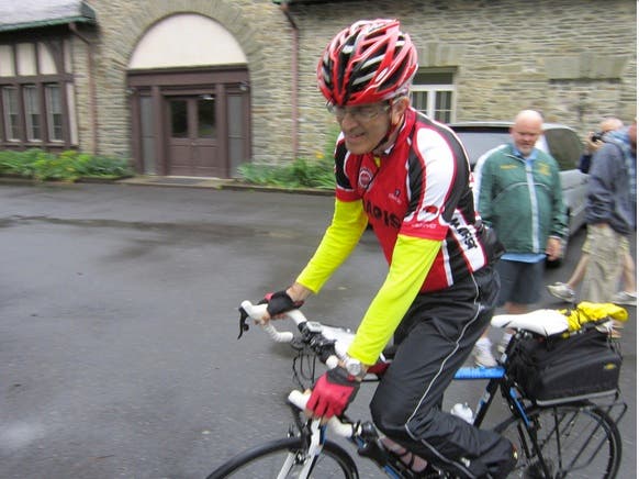 Caption: The old teacher is off! Owen Glennon starts his 1,004 journey by bike from the Marist Retreat Center in Esopus, NY, to Chicago.