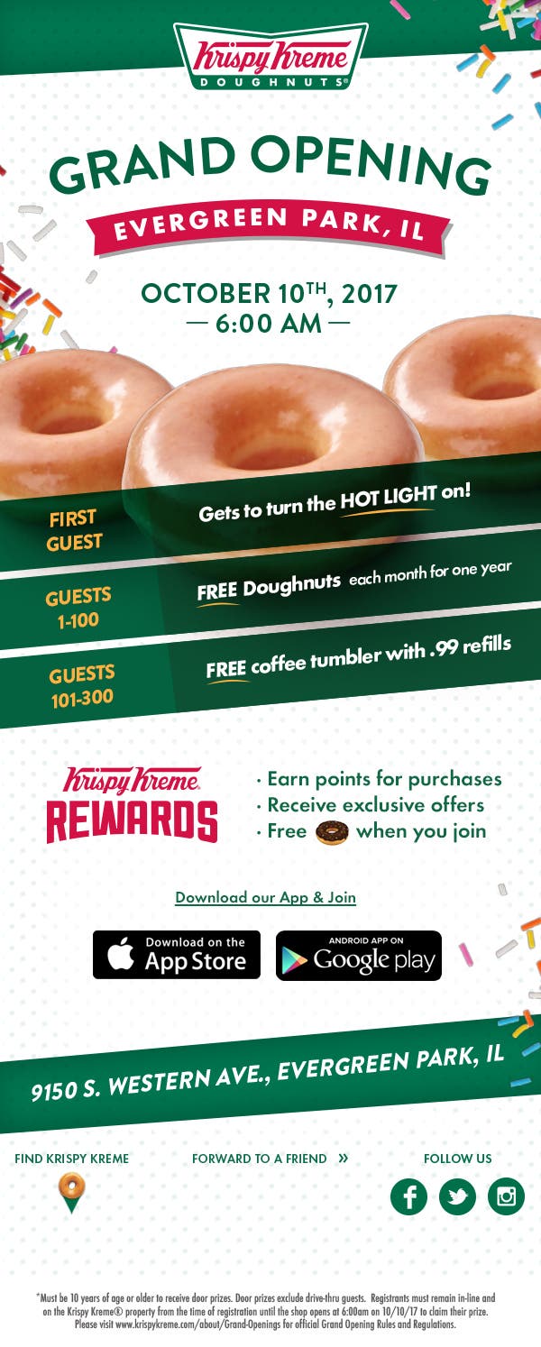 The highly anticipated grand opening of Krispy Kreme in Evergreen Park will honor the first 300 customers in line (drive-thru customers not included) with: