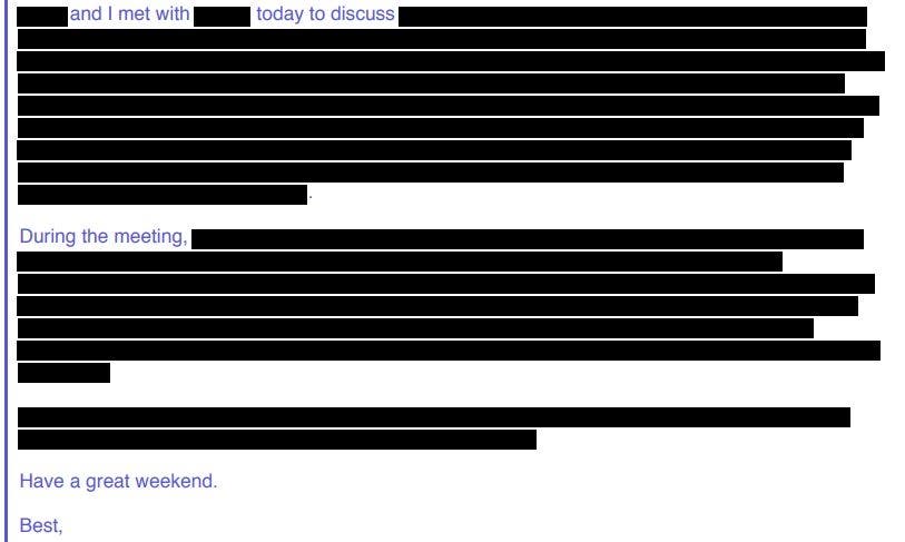 "Hi, Monica. [Redacted] and I met with [Redacted] today to discuss [Redacted paragraph.] During the meeting, [Two redacted paragraphs] Have a great weekend. Best, Matt Eriksen"