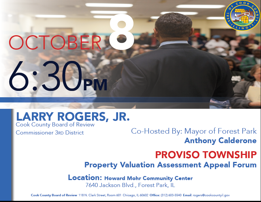 Property owners of Forest Park and Proviso Township are invited to a Property Valuation Appeal Forum on Wednesday, October 8th, hosted by my office and the Mayor of Forest Park Anthony Calderone at the Howard Mohr Community Center located 7640 Jackson Blvd. in Forest Park, IL 60130. Link Here: https://www.facebook.com/events/284124905119477/