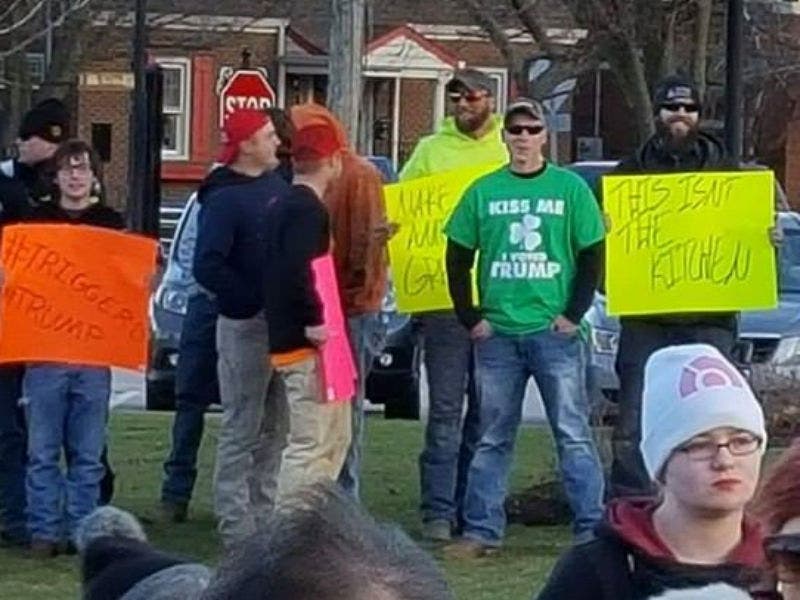 More than 100 people who gathered in Frankfort on International Women's Day were confronted by supporters of President Donald Trump.