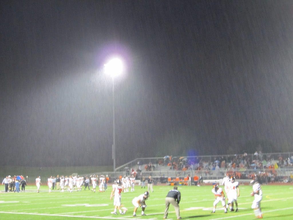 The Warriors fumbled eight times—losing four—during a game that was played in a steady rain for most of the evening. They also were intercepted once.