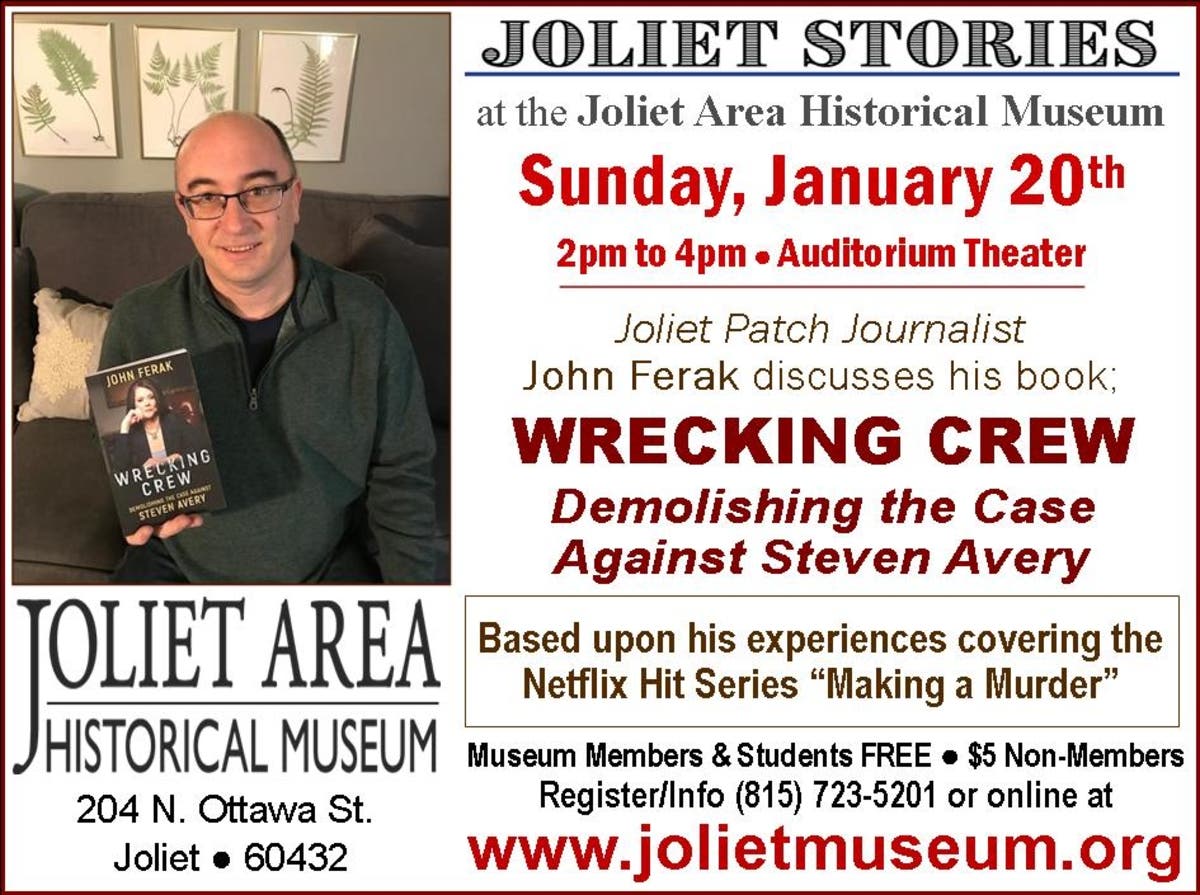 Joliet Patch journalist John Ferak will be discussing his experiences while covering the cases of the Netflix hit series: "Making a Murderer" and his new book "Wrecking Crew; Demolishing the Case Against Steven Avery" on Sunday, January 20th from 2pm - 4pm in the museum's Indoor Auditorium Theater.