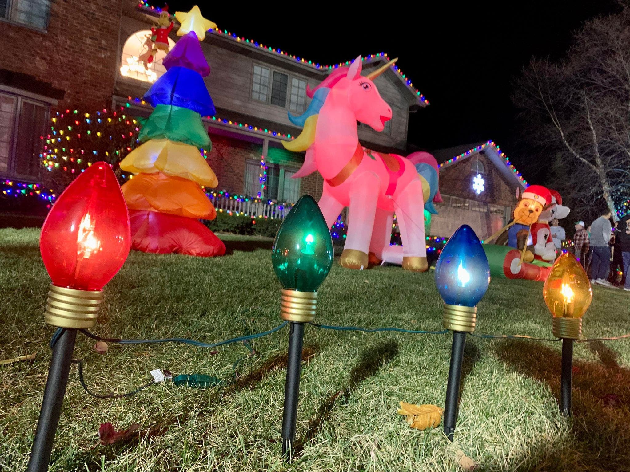 The decorating crew told Maggie's dad Pete that he should put out whatever decorations he already had, and they'd add to it. The decorations already on display included several inflatables—like a light-up unicorn.